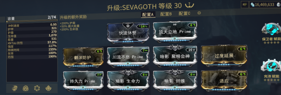 星际战甲SEVAGOTH战甲MOD搭配推荐是:快速修整、顶天立地 prime、翻滚防护、川流不息 prime、暗影 聚精会神、过度延伸、持久力 prime、暗影 生命力、暗影 纤维、适应。