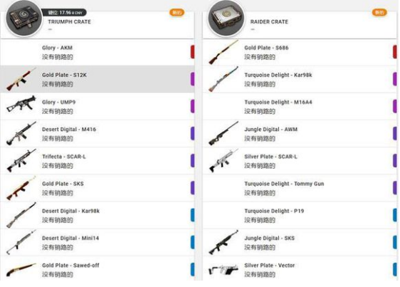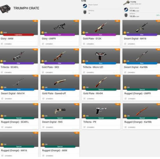 首先收费箱子名为“TRIUMPH CRATE”,需要购买钥匙开启。其中最稀有的红色品质皮肤为AKM,粉色为UMP9和S12K,紫色为M416、SCAR-L和SKS。因为网站图片并未全部加载好,所以看不到AKM皮肤是什么样的,不过看名称,外观应该和粉色的UMP9差不多。