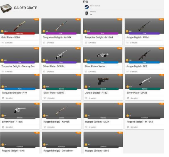 然后是免费箱子“RAIDER CRATE”,应该还是BP兑换。其中红色品质为黄金S686,粉色品质为98K和M16A4,紫色品质为AWM和Tommy Gun。