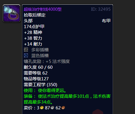 tbc时期工程制造的极品头盔,62级就能穿超过t4级别的头盔,除了工程没谁了。