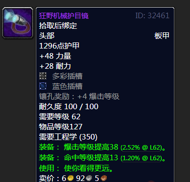②狂野机械护目镜:看名字就知道是狂暴战用的,非常的有野性。不仅提供了暴击属性,还提供了命中,要知道近战前期装备还是挺差命中的。装备的物品等级高达127,比t4套物品等级高出了7点。