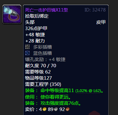 ③死亡一击护目镜X11型:盗贼专属的工程头,提供了高攻强高敏捷的属性,盗贼在tbc时期。1敏捷可以换成1攻强2敏捷可以换算成1暴击,所以这件装备对于盗贼来说提升了124点攻强24点暴击11点命中,前期盗贼穿上它,打副本还是打怪都像吃饭一样简单。