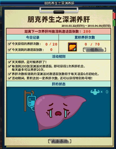 在“朋克养生之深渊养肝”活动中,每消耗200深渊邀请函可以获得一次养肝的机会。