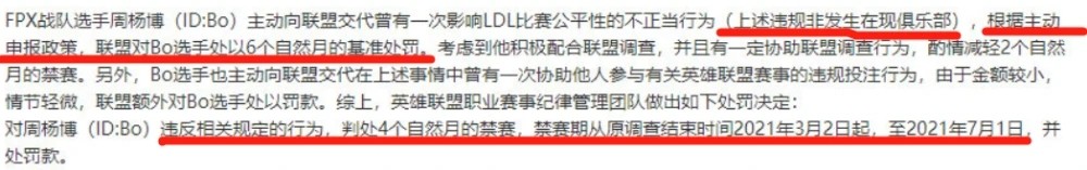 随着LDL在整顿之后。不少网友也都在关注着bo的处罚公告。在这个星期里面。英雄联盟官方终于是更新了关于LDL禁赛之后的调查消息。其中就包括了bo的处罚通告,但是看到了对于bo的处罚之后,大家也都惊了。为什么,处罚力度可以这么轻呢。才短短四个月的禁赛时间。这种处罚力度仿佛就在过家家一样。