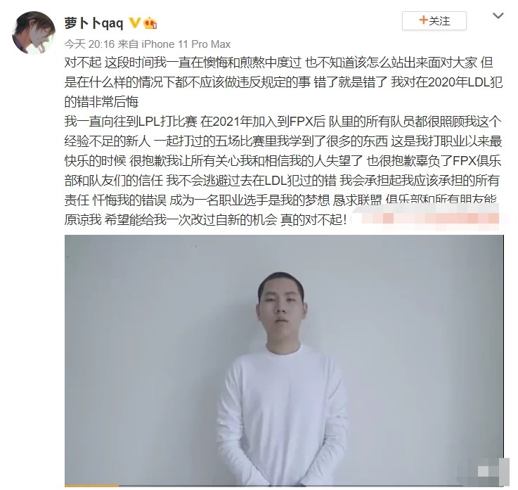 但是让大家没想到的是,波竟然在自己的微博上面。发出了一则道歉的声明。大概的意思就是这段时间自己非常的后悔。在2020年的时候曾犯下了很严重的错误。但是自己也很向往到LPL打比赛,在来到了fpx战队之后。队里的哥哥们很照顾自己这个新人,虽然只打了五场比赛,但是自己也学习到了很多的东西。自己不会再逃避曾经犯下的错误,所以希望俱乐部联盟以及网友能够原谅自己,给自己一个改过自新的机会。
