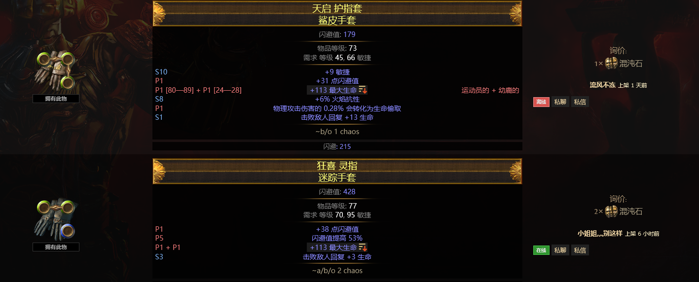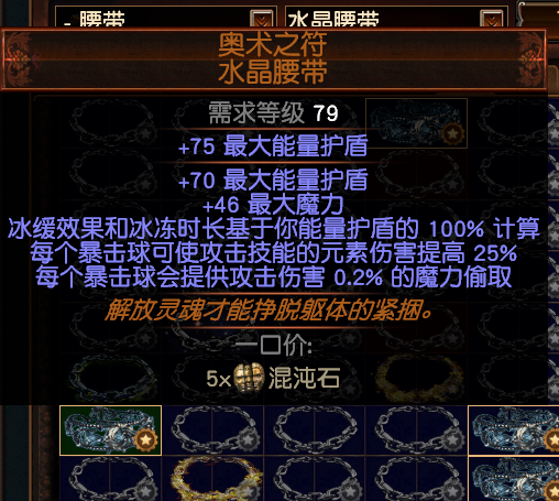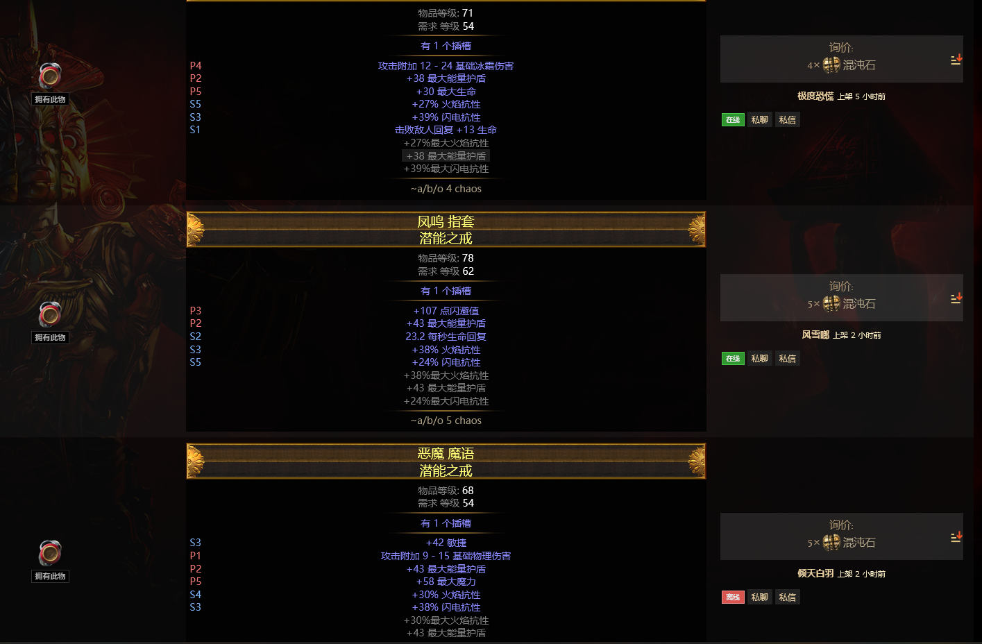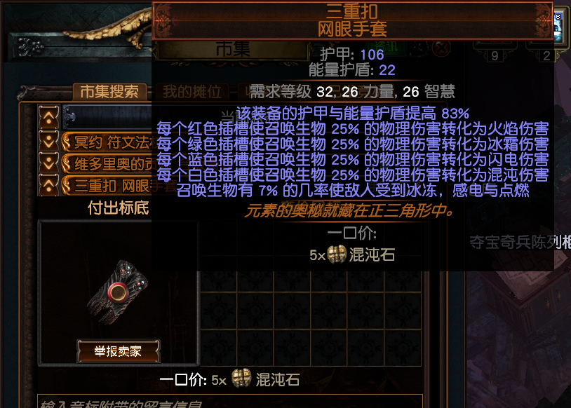 5、手套:三重扣,任意属性都行(洗出4绿插槽,召唤物100%转冰伤),前期通货少可以先洗3绿,不要买已腐化的,已腐化的难洗。视频有手套三重扣如何洗反色,工艺在矿坑获得,下个两三层工艺就齐了。