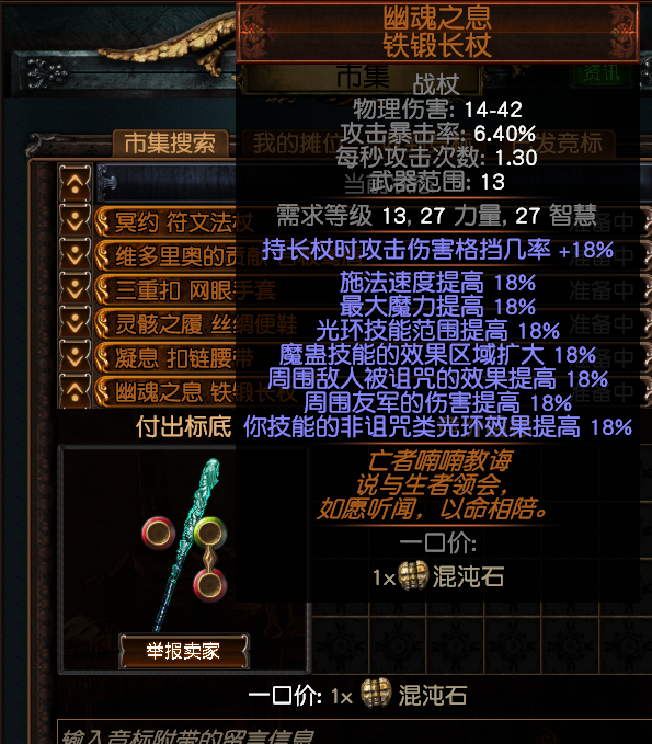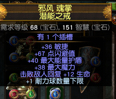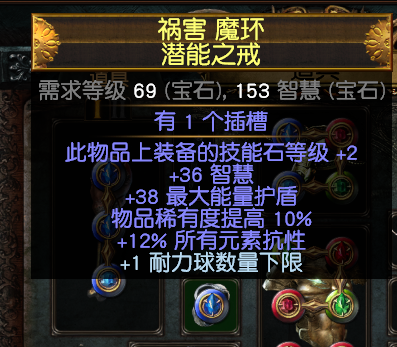 b:(元素盾版)戒指:潜能之戒,选择护盾+属性(力敏智都行)的,最好有一个+2技能石等级,为插上的腐化魔像加等级,空一后缀,工艺耐力球下限。