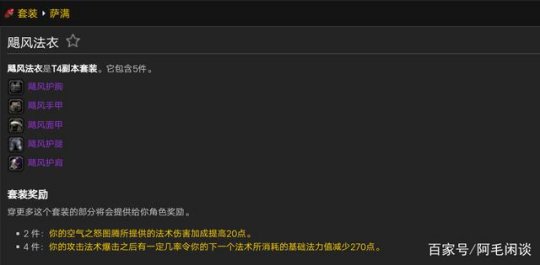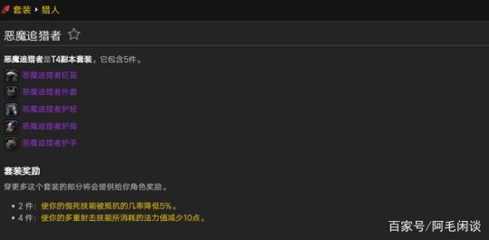 猎人套装延续了一贯的命名习惯,**追猎者,巨兽,巨人,巨龙,地穴,到了T4是恶魔追猎者,倒是很符合燃烧远征的剧情,猎人在TBC获得史诗级加强,终于不再是副本混子,成为顶级的输出职业。