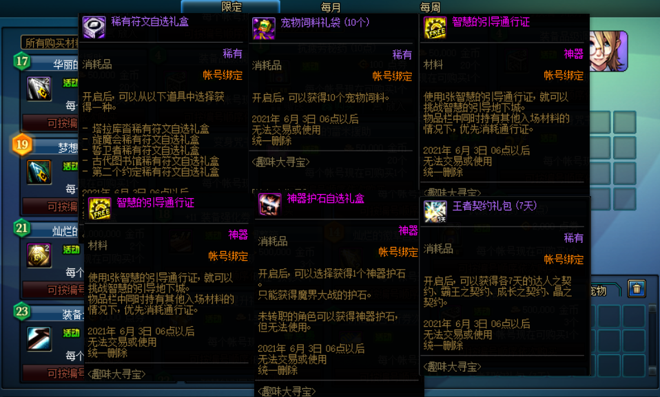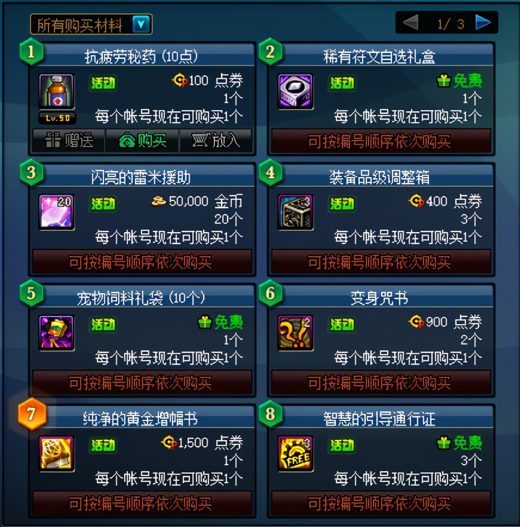 免费类道具并不真的免费,因为你还需要购买前置的道具,而这些道具总共是5种,契约、宠物饲料、通行证这些道具性价比不高,但自选的护石和稀有符文对于回归党或者新号来说还不错,不过要记住前面说的,并非真的免费!
