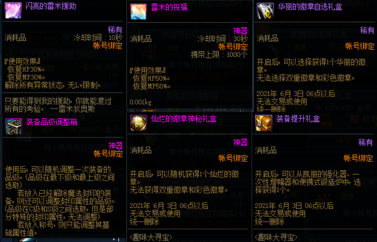 金币类道具也是6个,主要是雷米,华丽徽章自选3个,品级调整箱3个,装备提升礼盒5个和随机灿烂徽章2个,全部购买总计需要花费735万金币,按60的金币比例,也就是需要10左右,但这些道具似乎并没有太大的作用,不过装备提升礼盒5个150万高增幅时还可以。