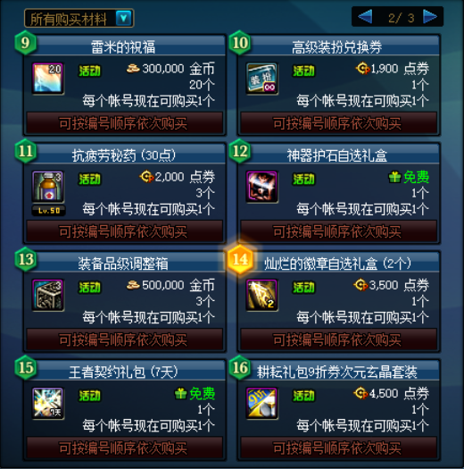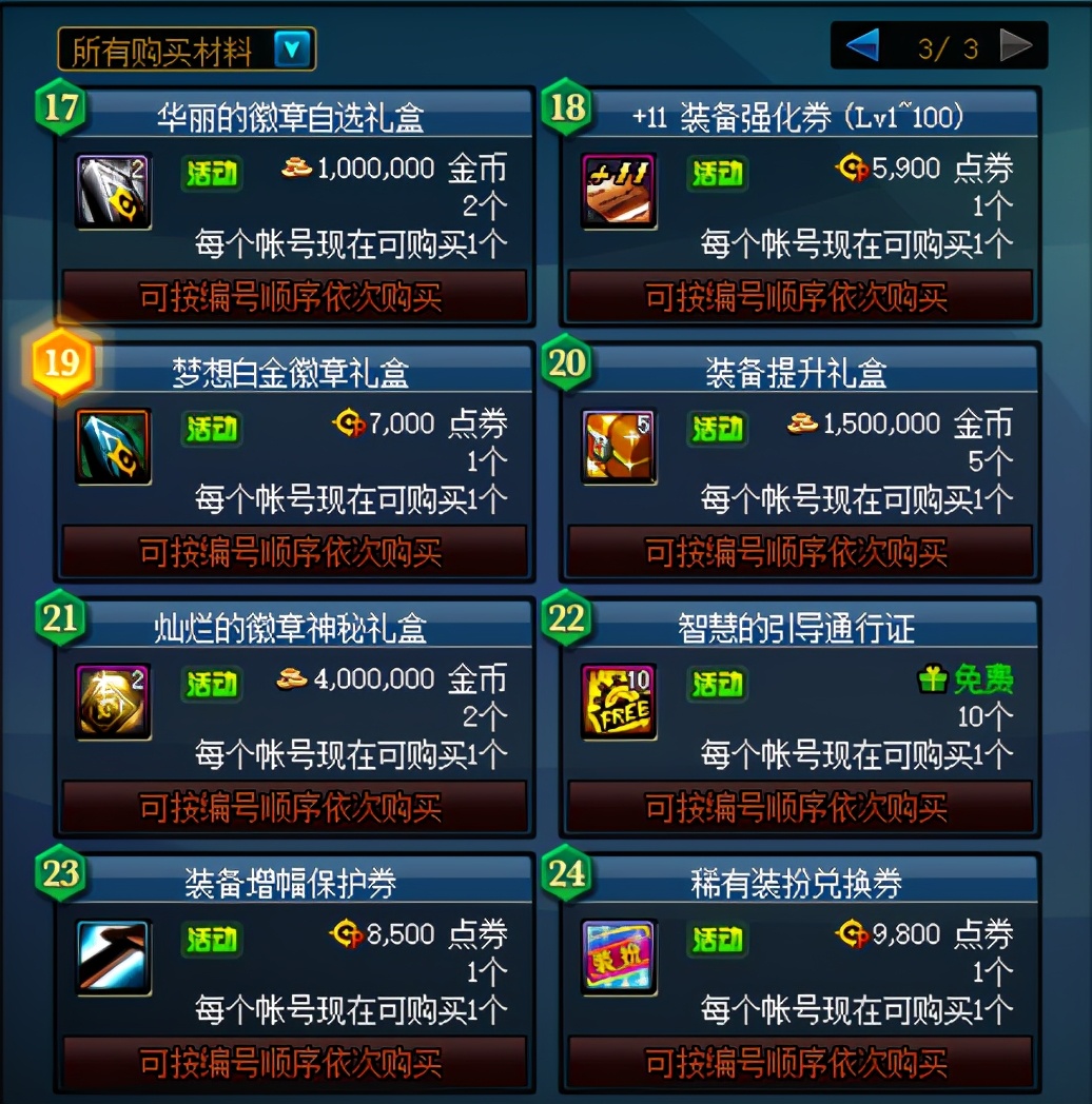 +11的强化券5900点券,对于需要强化耳环的玩家来说可以考虑下;7000点券的白金徽章,我记得当时活动有拍卖行3000万金币一个;8500点券的增幅保护券,在活动情况下,也就3000万金币一张,没有活动价格稍贵,但性价比不高,毕竟不是人人都玩高增幅;9800点券稀有装扮兑换券,也是只能换第12期的,还不如买2000点券的券子,加4件高级时装合成呢!