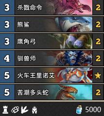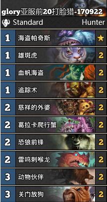 卡组介绍:手中有1费生物开局这套卡组才能控住局面,这套卡组虽然诠释了猎人的快,不过也保留了猎人的短板,后期手牌的不足和直伤的不够都是猎人的弱点,但如果你控制住了局面基本也就赢了。