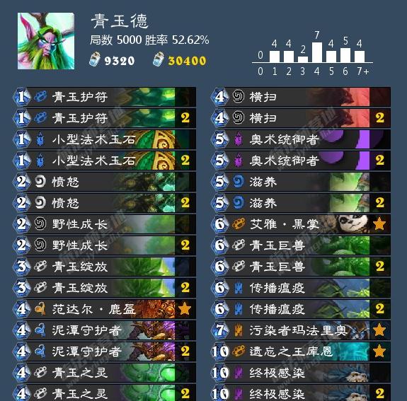 总结:德鲁伊青玉德这套卡组和之前的卡组没有太大的区别,就是加了德鲁伊宝石卡,但是效果还是很强的,有兴趣的玩家可以试试。