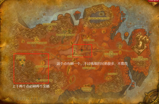 这是地狱火半岛的刷点,一共三个,左边两个由于任务恶心,一般练级会选择快进快出,所以容易捡漏。如果你是矮人......
