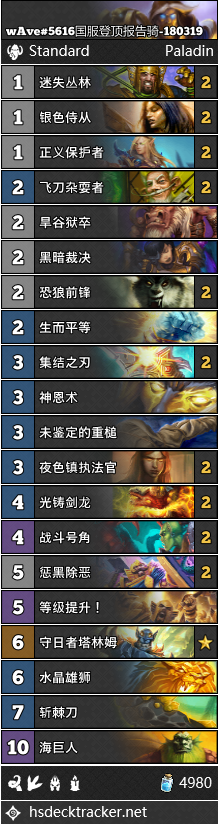 大家好呀,今天又给大家带来新的卡组介绍了,今天带来的就是国服的一位大神wAve#5616登顶国服用的一套骑士的卡组喔,作为一位公测开始玩的玩家,第一次登顶国服使用的卡组肯定有着不俗的实力,大家一起来看看吧!