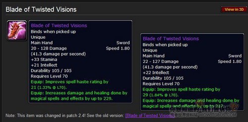 扭曲预言之刃属性,拾取后绑定,唯一,主手剑,21-128伤害,速度1.80,(每秒伤害41.4),+33 耐力,+21智力,耐久度105/ 105,需要等级70,物品等级138,装备:急速等级提高21(1.33%@ L70)。装备:使法术和魔法效果的治疗和伤害提高最多229点。