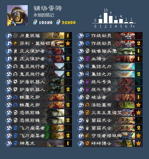 冲分过程中使用了自己组的一套铺场蛋骑,最高打到了狂野第三,并且还帮战队里的小伙伴用三个小时从五级上了传说,足以证明这套牌的强度。闲话少叙,让我为大家讲解一下这套卡组构成与对局技巧。