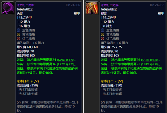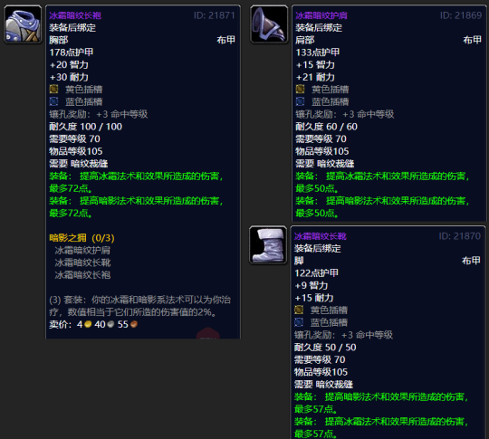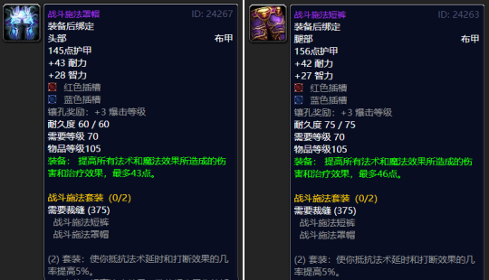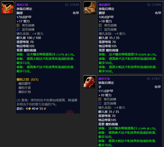 除了上述拾取绑定的三件套之外,TBC初期还增加了三套裁缝制品,这些都是可以交易的,但是套装属性的触发需要学习裁缝(参考ZG时代的血藤套)。这三个套装都是两件套,完美契合前面的三件套可以搭配成3+2的组合,这些套装的套装效果如下: