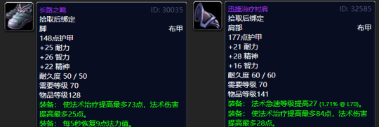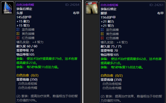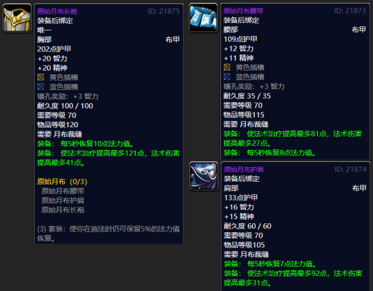 如果你是治疗,那么原始月布三件套非常适合你用,增加智力/精神/治疗效果/五回,三件套也非常实用,施法保持5%的回蓝。
