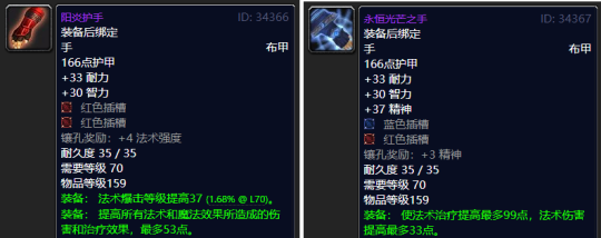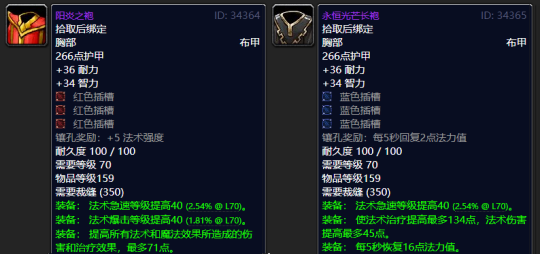 整个TBC资料片的BIS胸甲,也是裁缝才可以做出来自己穿的BOP产品,那就是阳焰长袍和永恒光芒长袍。其中阳炎长袍是全法系全版本BIS装备,比掉落的同级别胸甲多出23点副属性。