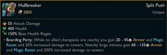 当你周围没有友方英雄时,你会获得20-45护甲和魔抗,并且对防御塔造成的伤害增加20%,周围的炮车兵会获得60-135护甲和魔抗并对防御塔造成的伤害增加200%