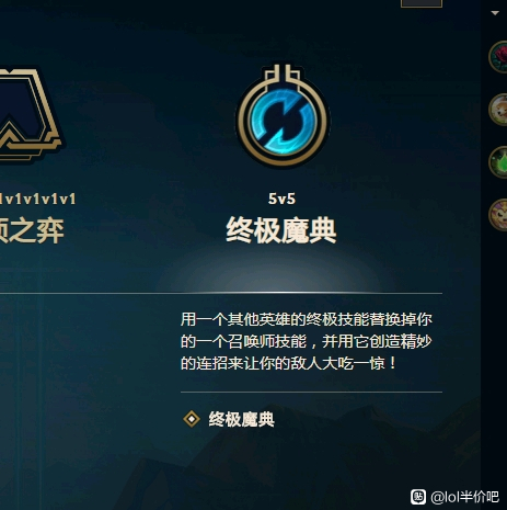 LOL终极魔典模式玩法攻略:选取阶段,没有禁选环节。可以选择只带一个召唤师技能,另一个位置空出来,进入游戏后 选择一个终极技能。如果带两个召唤师技能,进入游戏后 也是需要放弃一个召唤师技能来选择一个终极技能。