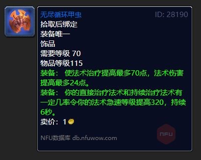 分析:听说是内置45秒CD,但是作为为数不多加急速的饰品虽然不是主动的,但是合适的职业跟场合感觉也有一席之地,适合职业SM,奶Q入手。