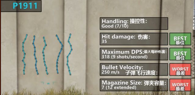 评:P1911子弹伤害高,但是弹夹容量小,子弹飞行速度慢。