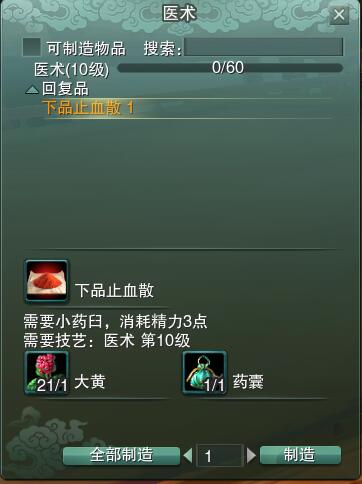 医术也就是大家常说的制药,所需要的材料为神农技能所采集的草药。药囊NPC有卖。
