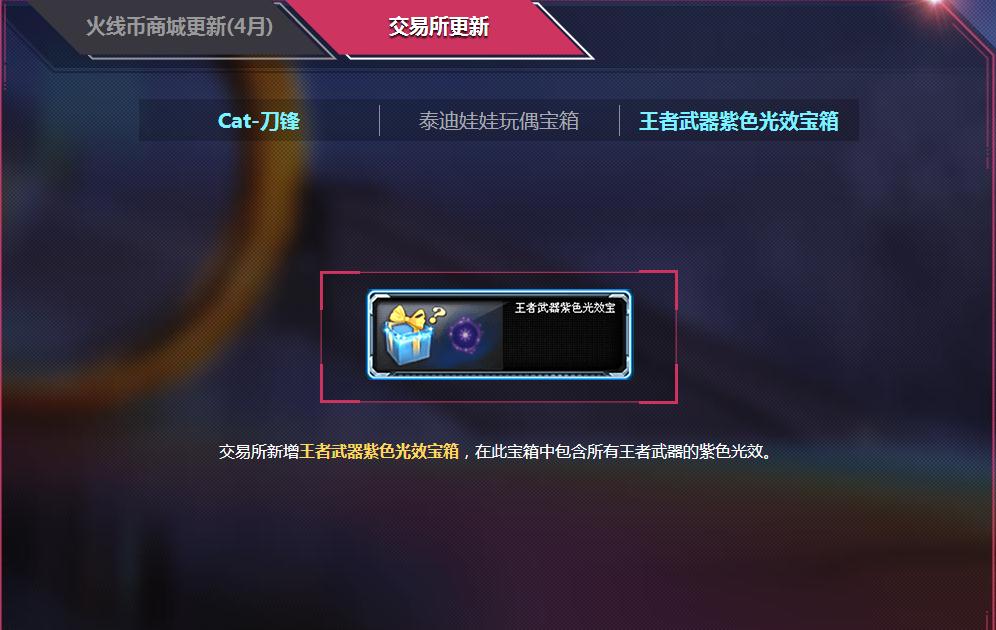 交易所新增王者武器紫色光效宝箱,在此宝箱中包含所有王者武器的紫色光效。