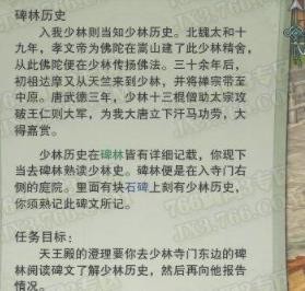 在少林地图天王殿的NPC澄理处接到任务《碑林历史》。根据任务提示,天王殿的澄理要你去少林寺门东边的碑林阅读碑文了解少林历史,然后再向他报告情况。
