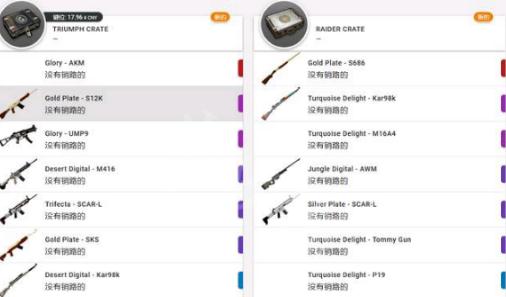 然后是免费箱子“RAIDER CRATE”,应该还是BP兑换。其中红色品质为黄金S686,粉色品质为98K和M16A4,紫色品质为AWM和Tommy Gun。