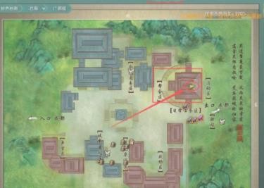 按M打开地图,从1号点大轻功飞到大堂内的2号点。