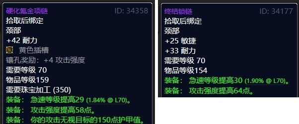 终结锁链多25敏捷,珠宝项链多4爆击等级+83攻强,再粗略按照1点主属性≈1点副属性≈2点AP来计算的话,相当于珠宝项链高出41攻强。所以珠宝加工是物理系职业的最强专业选择。