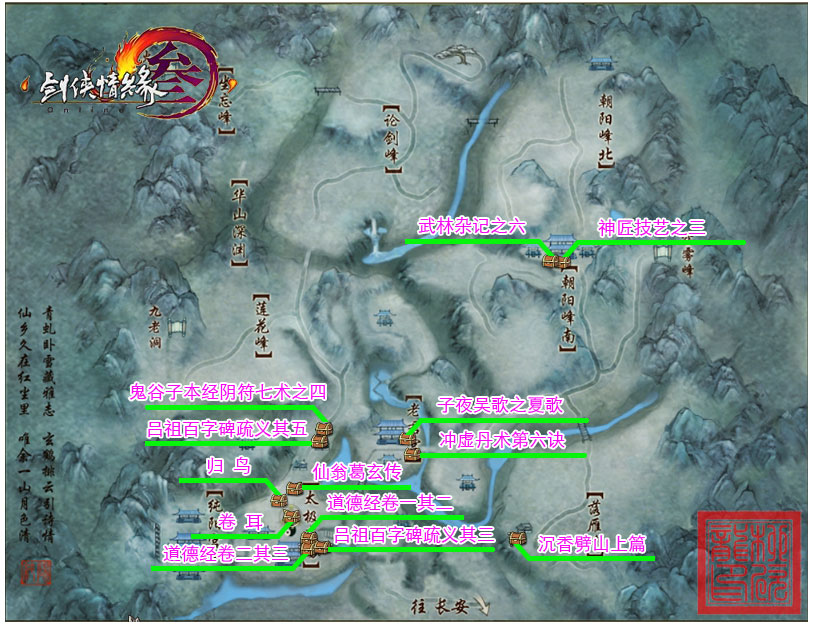 | 沉香劈山上篇 | 25 | 杂集18 | 浣花笺1、朱砂墨1 | 落雁峰大地图雪华林沉香劈山处房子左侧 |