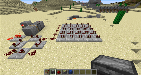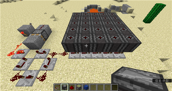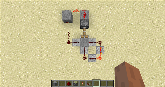 材料是快捷栏里的任意方块,拉杆,红石,粘性活塞,红石火把和红石中继器。