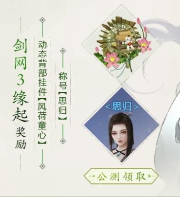 公测后可领取《剑网3缘起》“思归”后缀称号和“风荷童心”背部挂件(绑定版,永久)。