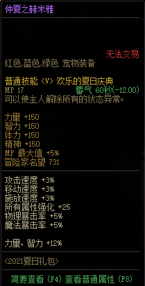 DNF仲夏之赫米雅是玩家在2021夏日套礼包中获得的宠物,属性要比春节宠物弱一点,不过也可以先过渡使用,那么DNF仲夏之赫米雅宠物属性是什么?下面就给大家带来DNF仲夏之赫米雅宠物属性介绍。