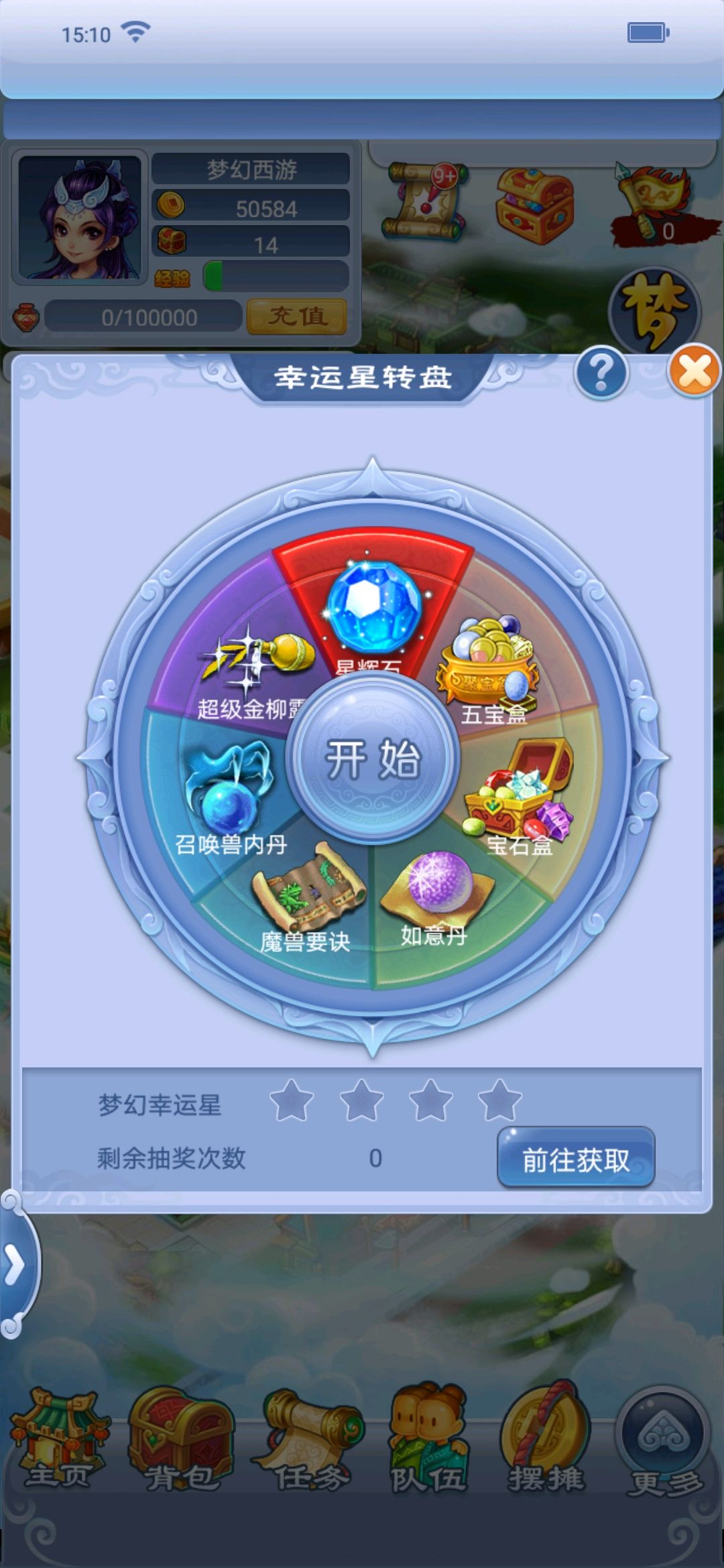 集齐4颗梦幻活跃星可获得1次幸运星转盘抽奖的机会,必定获得五宝、魔兽要诀、如意丹、星辉石等物品奖励。