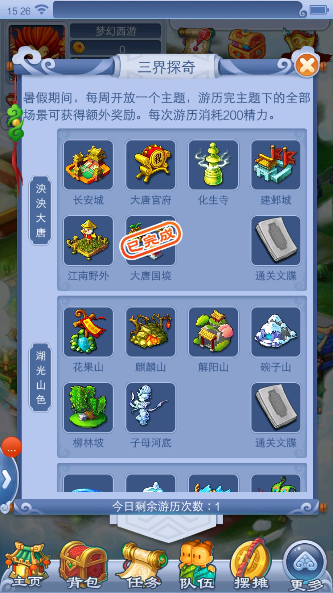活动期间,点击突发事件中的“三界探奇”图标参与玩法。玩法中有九个场景主题,暑假每周会开放一个场景主题。玩家可以选择任意已开放的场景进行游历,每天有1次游历机会。每次游历消耗200精力,必定获得经验奖励,还有机会额外获得特赦令牌、魔兽要诀等额外物品奖励。此外,游历完任意主题下的全部场景后,可点击相应主题下的通关文牒,获得额外物品奖励。