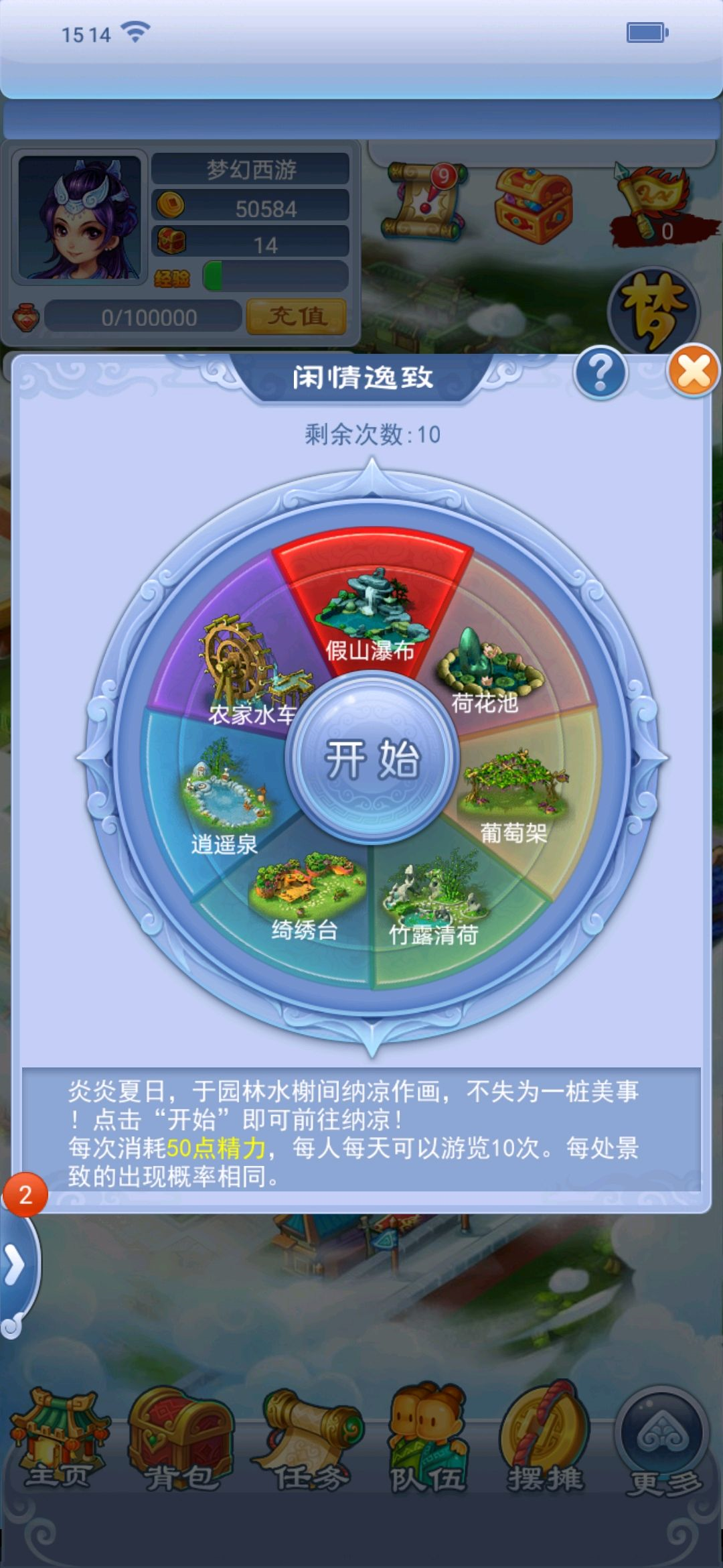活动期间,点击突发事件中的“闲情逸致”按钮参与玩法。点击“开始”即可前往纳凉一处园林景致游览纳凉。游览园林景致必定获得经验奖励,还有机会额外获得五宝、魔兽要诀、超级金柳露等物品奖励。每人每天可品尝10次,每次消耗50点精力。园林景致每天可以接待的游客有限,有需要的少侠还请尽早。