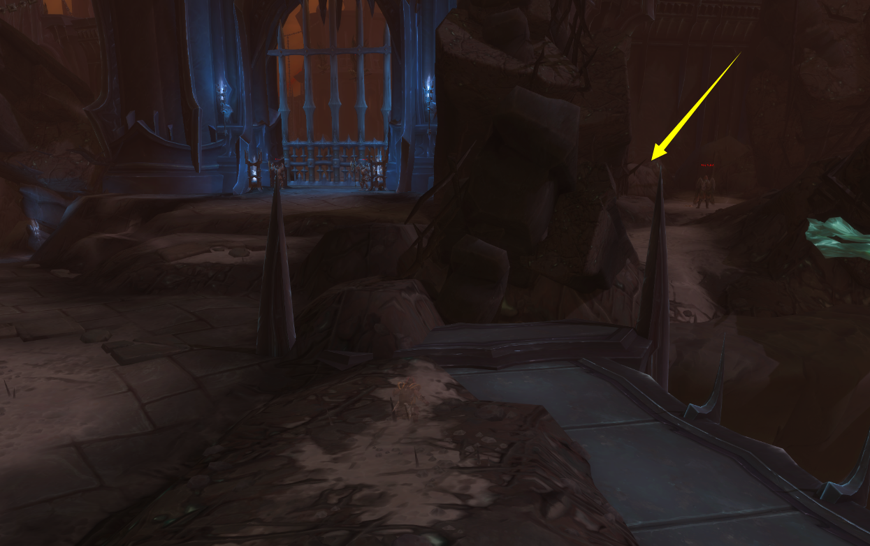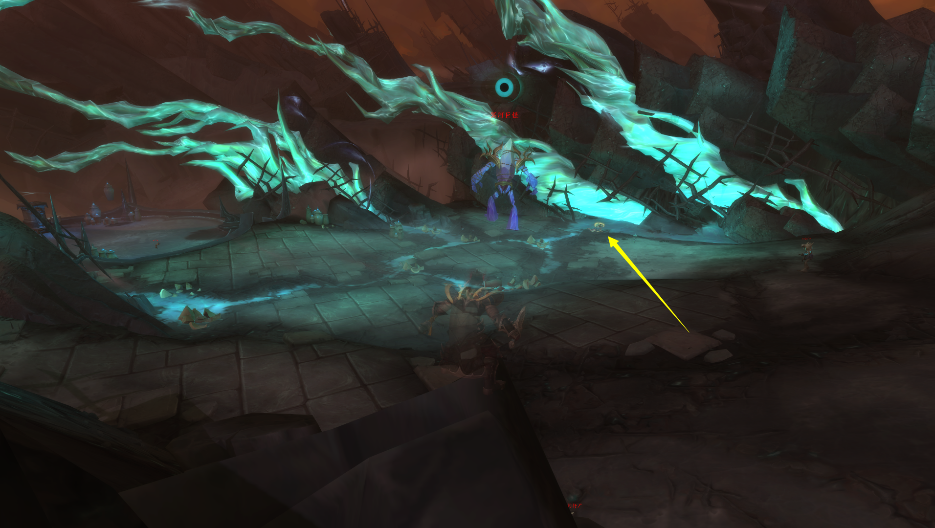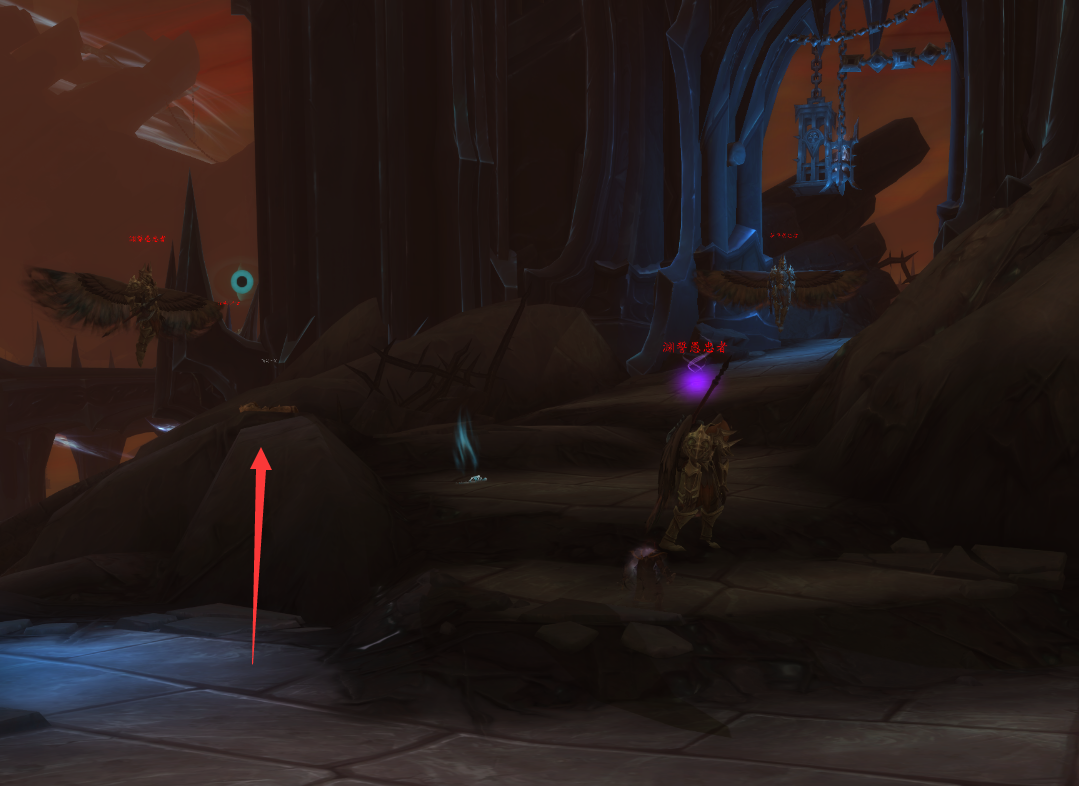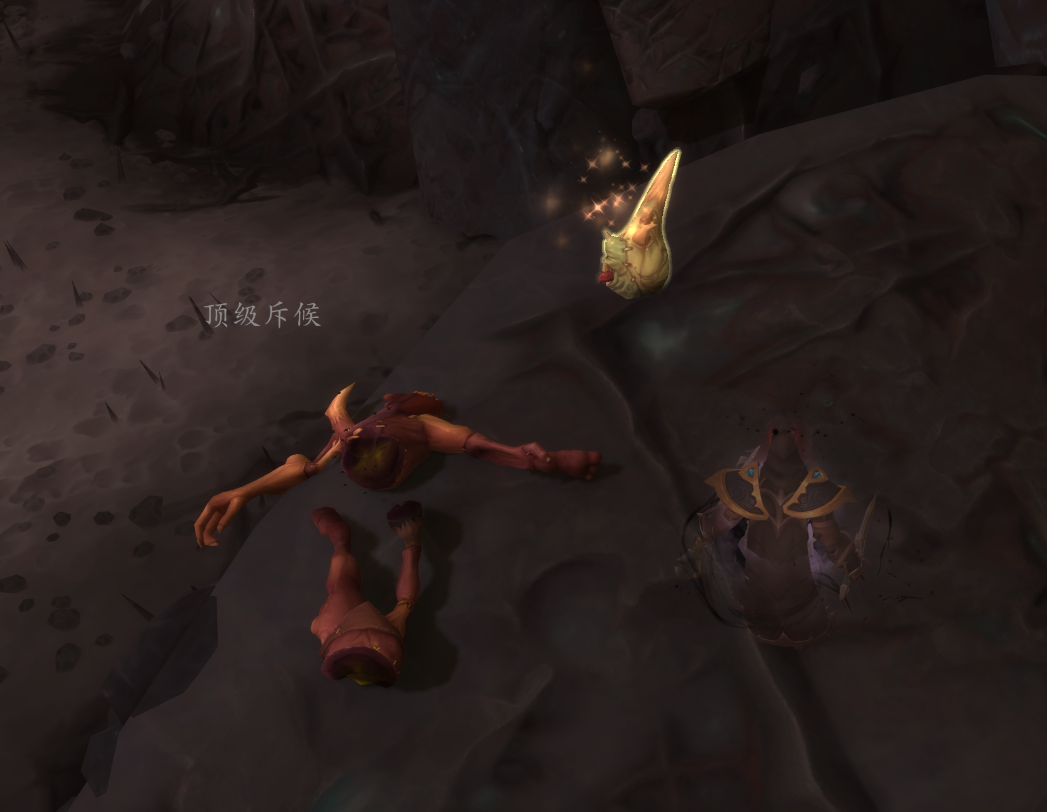 这里可以看到这样一个像水晶矿脉一样的地形,而在这三根水晶矿脉的中间那一根旁边的地上就躺着斥候的尸体: