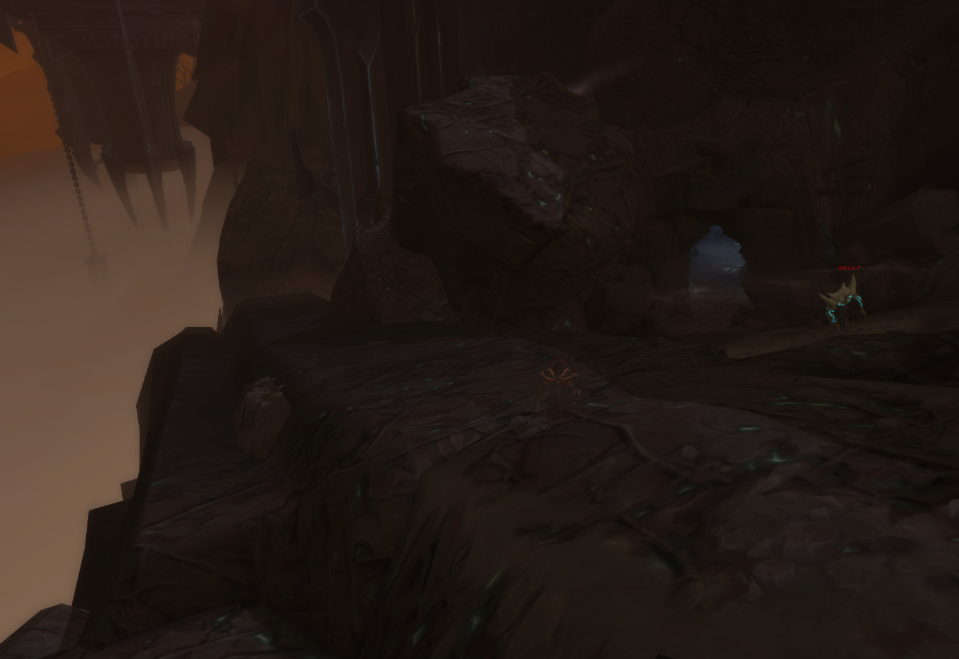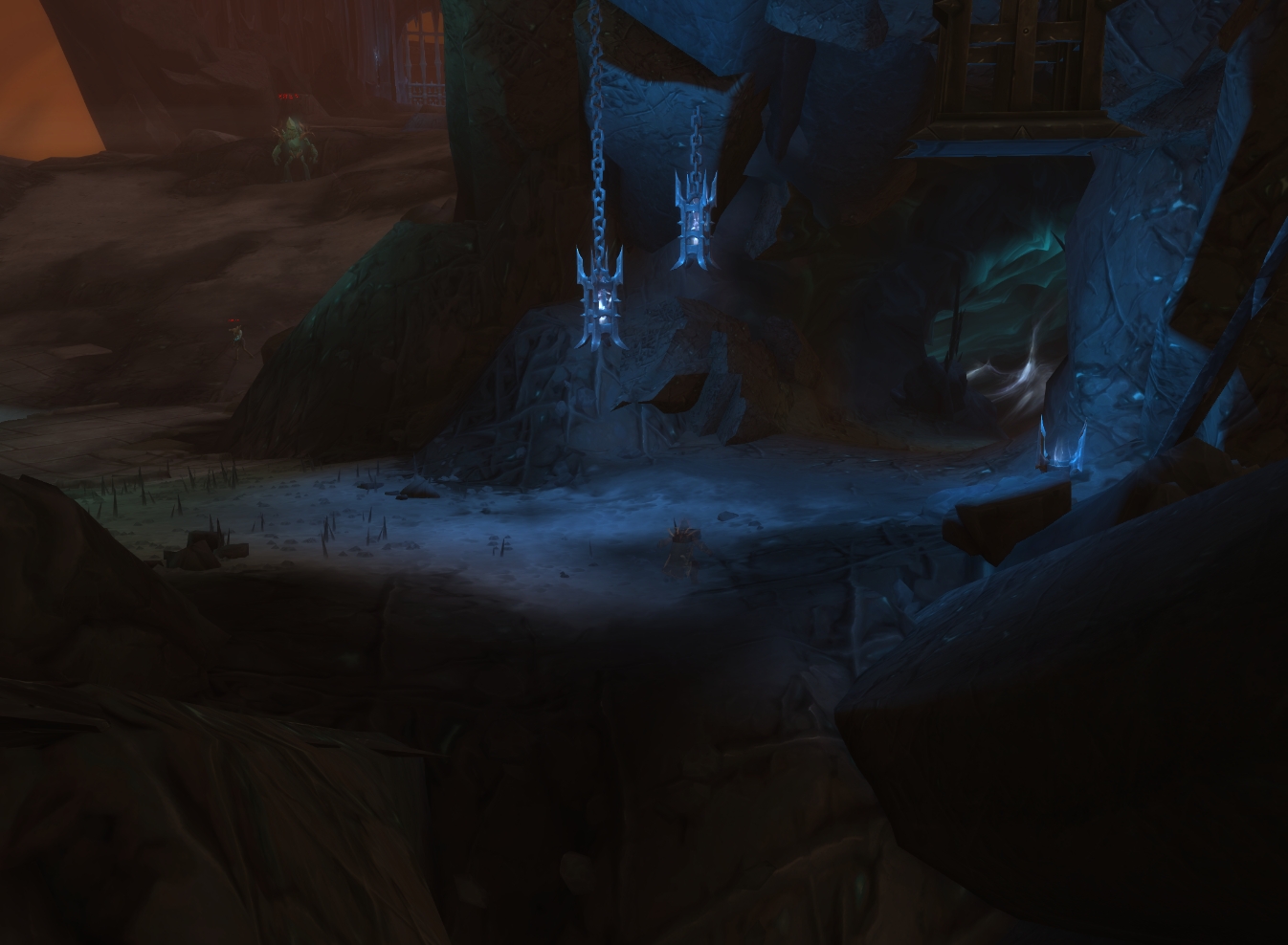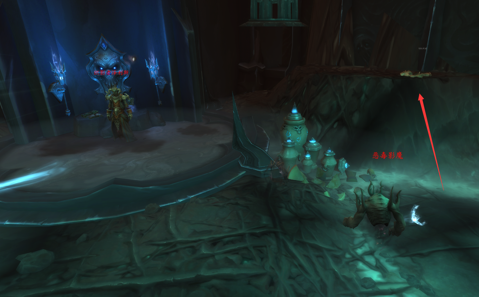 这里可以看到这样一个像水晶矿脉一样的地形,而在这三根水晶矿脉的中间那一根旁边的地上就躺着斥候的尸体: