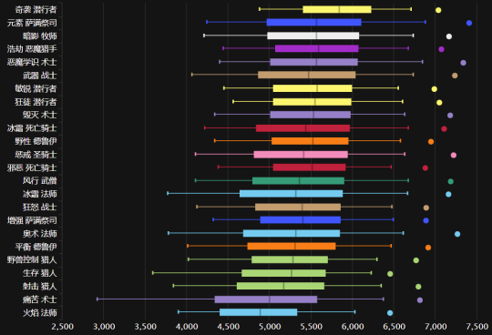 如果我们把规则调整到所有百分比的排行,我们可以看到盗贼成为了第一名!然后元素萨、暗牧排在第二第三,恶魔猎手的输出情况也有了很大的改善,成功达到了第四位。