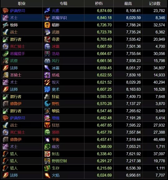 我们从最新的H统御圣所的职业专精的95%排行可以看到,元素萨成为了榜首的位置,紧跟其后的是恶魔术士,这两个专精都以较大的幅度超越其他专精。暗牧依旧强势排行第三,而第四名成为9.1玩家最大的惊喜,武器战崛起了。