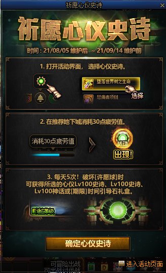 DNF开启了祈愿心仪史诗活动,玩家可以进行史诗祈愿,每天都有机会掉落祈愿史诗,通关推荐地下城次数越多掉率越高,下面就给大家带来DNF祈愿心仪史诗活动攻略。