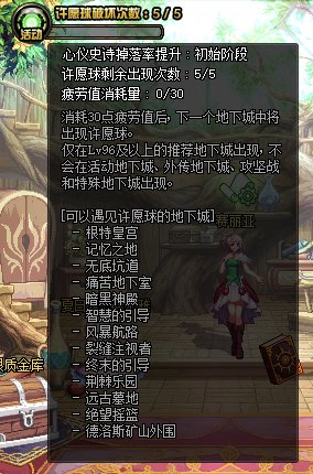 每消耗30点疲劳值会出现一次许愿球,每天5次,许愿球随机掉落祈愿史诗、百级史诗、神话或引导石。