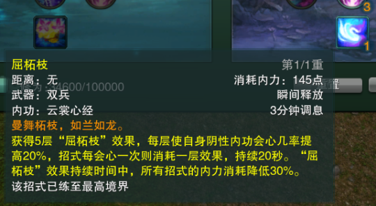5层提高会心几率100%,降低蓝耗,调息时间3分钟较长,一般配合左旋使用使左旋第一跳群加必会心。在无左旋使用环境的时候也可以配合其他大加(王母、风袖)使用使大加必会心和提高接下来的4个技能如填充gcd的回雪的会心几率。(回雪一跳就会消耗一层屈拓枝)