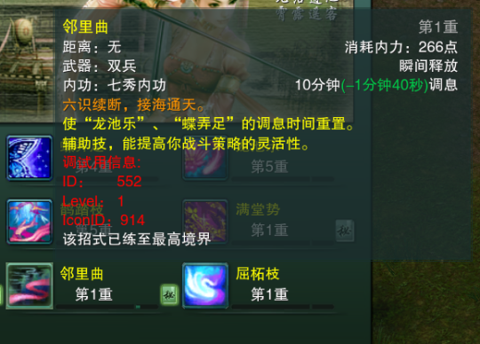 我姑且把它归为爆发技能吧,10分钟调息时间(配合减调息时间秘籍可降到5分钟调息时间 )重置龙池乐、蝶弄足调息时间,pve奶秀一般用于重置龙池,增加续航能力。