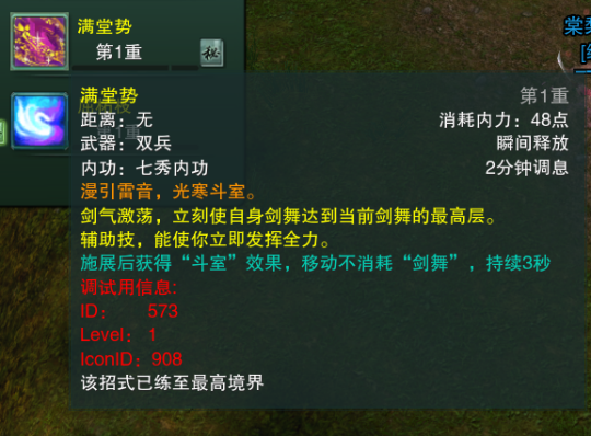 2分钟调息(配合减调息时间秘籍可降到1分钟调息时间),马上回复到10层剑舞,配合镇派使用可以移动不消耗剑舞,持续6秒。